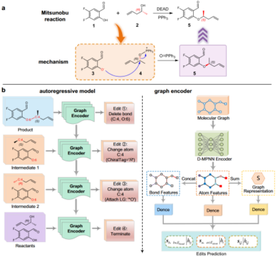 在逆合成最佳步骤预测领域中,目前逆的合成模型在预测精度、多样性以及可解释性等方面的局限性限制了其在合成路线规划中的实际应用。如何从化学家思考反应发生的角度出发提升基于AI的逆合成预测模型的效果和适用性仍然是一个迫切重要的研究课题。为此,论文基于反应转化的简易机理提出了一种基于图神经网络的图到编辑架构Graph2Edits,用于逆合成预测,如图5所示。具体地说,模型将逆合成反应预测表示为通过一系列相互关联的图编辑来完成产物-中间体-反应物推导的过程来学习反应转化的规则,就像化学家思考反应是如何发生的一样;端到端的模型架构以自回归的方式生成任意长度的图编辑序列,能够增强多个生成步骤之间的紧密联系,提高其在多中心反应中的适用性和预测的多样性;使用定向消息传递神经网络D-MPNN对局部原子/键和全局图特征进行编码以充分利用化合物的结构信息来预测原子/键编辑和生成终止符,并将作为离去基团的子图添加到中间体完成反应物的生成以贴近更真实的反应转化过程,可以显著减少生成步骤,提升其预测性能。相关研究成果已发表在Nature Communications(//www.nature.com/articles/s41467-023-38851-5)。