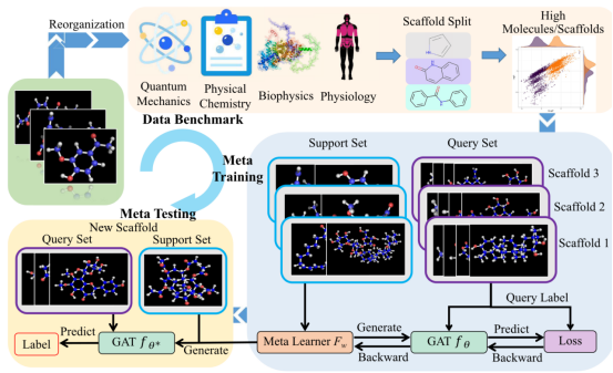 在化合物性质预测领域,深度神经网络在加速与提升药物发现过程方面已取得显著进展。然而,这些技术往往需要大量标注数据,才能对分子特性进行精确预测。现实中,在药物研发初期阶段,对于新型分子或其类似物,相关理化性质与生物活性数据的缺失依然是重大难题。这一困境使得将深度神经网络应用于少样本药物发现面临严峻挑战。为此,论文提出了一种结合图注意力网络(Graph Attention Network, GAT)的元学习框架——Meta-GAT,用以在低数据条件下预测化合物性质,如图3所示。GAT通过三重注意力机制从原子层面捕捉原子团的局部影响,从而有效学习原子团对化合物整体性质的贡献。此外,课题组还构建了一个专用于化合物性质预测的元学习基准数据集(Meta-molnet),如图4所示。相关研究成果已发表在TNNLS(//ieeexplore.ieee.org/abstract/document/10436119,//ieeexplore.ieee.org/abstract/document/10059171)。