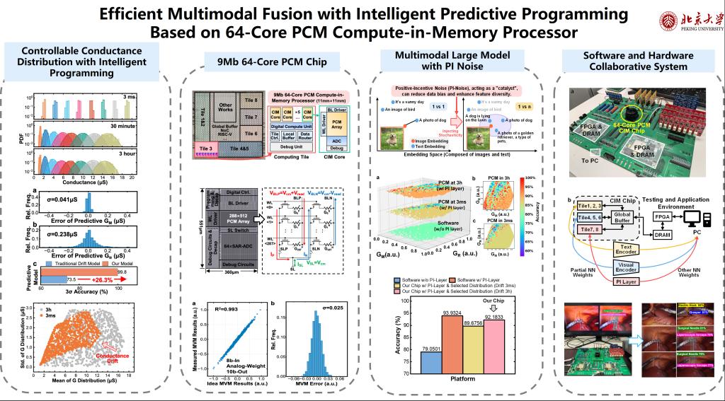 随着人工智能向通用人工智能(AGI)演进,融合图像、文本等多种数据源的多模态模型成为研究热点。然而,在资源受限的边缘设备上部署这些模型面临着巨大的算法与硬件挑战。杨玉超教授课题组联合中科院上海微系统所宋志棠研究员团队,研制了一款基于40nm工艺的9Mb 64核相变存储器(PCM)存算一体SoC级处理器。