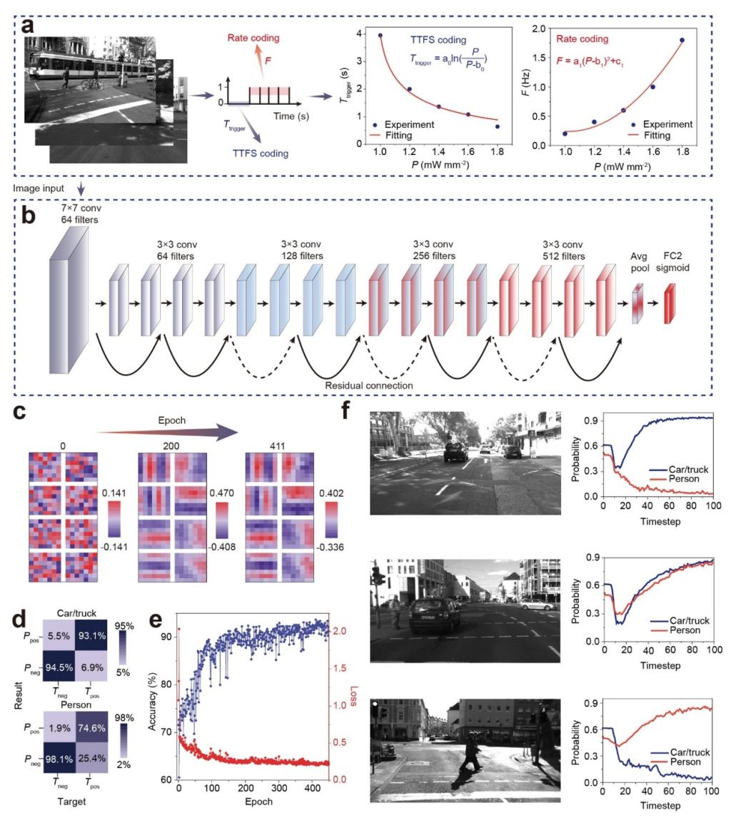 除基础色彩识别外,研究团队进一步将提出的视觉神经形态系统拓展至自动驾驶等复杂机器视觉场景。在多噪声道路环境中,系统通过光电LIF神经元将环境图像转换为脉冲序列,并采用首脉冲时间(TTFS)与速率编码相结合的混合策略,实现快速响应与鲁棒性的兼顾。编码后的脉冲信号输入脉冲神经网络模型完成特征提取与分类判断。最终,系统在测试集上实现了93.5%的目标检测准确率,表明该平台具备处理真实复杂场景的能力。