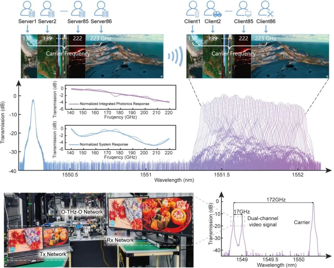研究团队采用集成光学方案,实现了250 GHz以上超大带宽的光电/电光转换器件,薄膜铌酸锂调制器(TFLN MZM)和磷化铟探测器(InP UTC-PD)带宽均创纪录。基于上述器件,研究团队实现了光纤-无线一体化融合系统演示,光纤通信实现破纪录的单通道256Gbaud(512Gbps)信号传输,太赫兹无线通信实现破纪录的单通道400Gbps信号传输,并完成了86路8K高清实时视频的无线传输演示。这一里程碑式的突破有望重塑电信通讯系统架构,为未来全光互联的愿景奠定研究基础,推动我国在该领域实现跨越式发展。