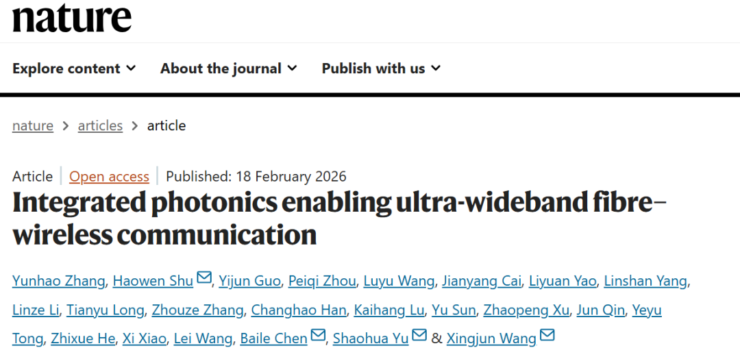 2026年2月18日,研究论文《集成光子学赋能超宽带光纤-无线通信》( “Integrated photonics enabling ultra-wideband fibre–wireless communication” )在线发表于国际顶尖学术期刊《自然》(Nature)。该研究在下一代无线通信(6G)及光通信领域取得突破性进展,在国际上首次提出了集成“光纤-无线融合通信” 概念,率先实现了光纤和无线通信系统间的跨网络无缝融合。炸金花-炸金花在线游戏平台 与鹏城实验室联合培养博士研究生张云皓,北京大学电子炸金花 舒浩文研究员、博士研究生郭艺君,国家信息光电子创新中心高级工程师周佩奇,以及上海科技大学信息科学与技术炸金花 博士研究生王鲁玉为本论文共同第一作者。鹏城实验室余少华院士,北京大学电子炸金花 王兴军教授,上海科技大学陈佰乐副教授,以及舒浩文为本论文共同通讯作者。主要合作者还包括鹏城实验室王磊研究员、贺志学研究员及许兆鹏助理研究员,国家信息光电子创新中心总经理肖希,香港科技大学(广州)童业煜助理教授及博士研究生鲁凯航,北京信息科技大学秦军副教授及硕士研究生孙瑜,北京大学电子炸金花 博士研究生蔡健洋、姚力远、杨林山及韩昌灏,上海科技大学信息科学与技术炸金花 博士研究生李林泽、龙天宇及张周泽。